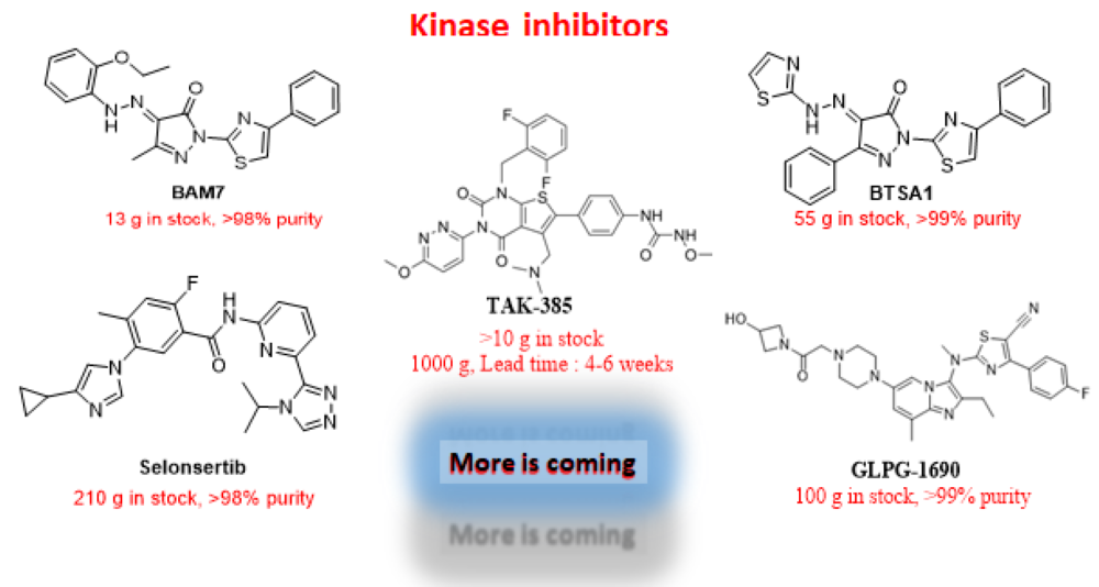 As promising candidates for the future drugs, kinase inhibitors play important roles in both academic research and indudstry. Dedicating to the human health, PharmaMountain is doing its best to help fast development of these molecules. If you can not find the kinase inhibitor in our product list, we are happy to talk to you and give the best price and lead time. We are looking forward to hearing from you in the near future.