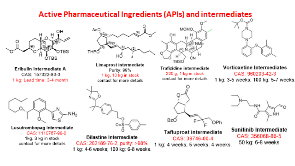 As one of leading CRO compamies with strong R&D background, we have accomplished the manufacturing of a bunch of complicated marketed drugs from the lab to industry, including Trabectedin, Eribulin mesylate, Vorapaxar Sulfate etc. We have own lab and factory and we are now accepting new orders from all accross the US and other countries. With extensive experiences and enthusiam for research work, we are dedicated to providing satisfactory service to the family of either academy or industry. We are looking forward to hearing from you!